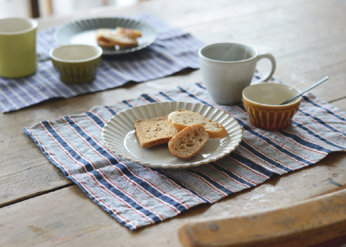 こだわって作られたスタジオ エムのリネン生地のランチョンマット。いつものテーブルに加えるだけで、雰囲気も明るく華やかになる。