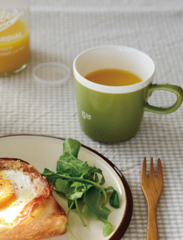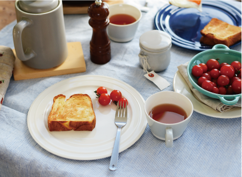 パンやオムレツの横に、サラダやスープカップも一緒に盛りつけがしやすい。テーブルにも変化がでるので、丸形の器が多い方にはオススメ。
