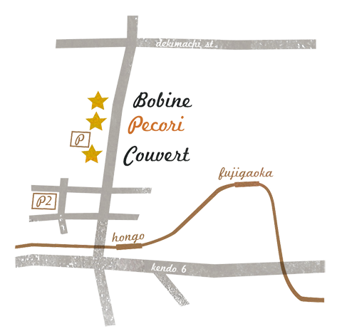 東名高速名古屋インターI.C.下車 尾張旭方面へ、1つ目の交差点「本郷」を右折、名古屋インターより5分。駐車場は2店舗の間に5台、一筋西側に11台