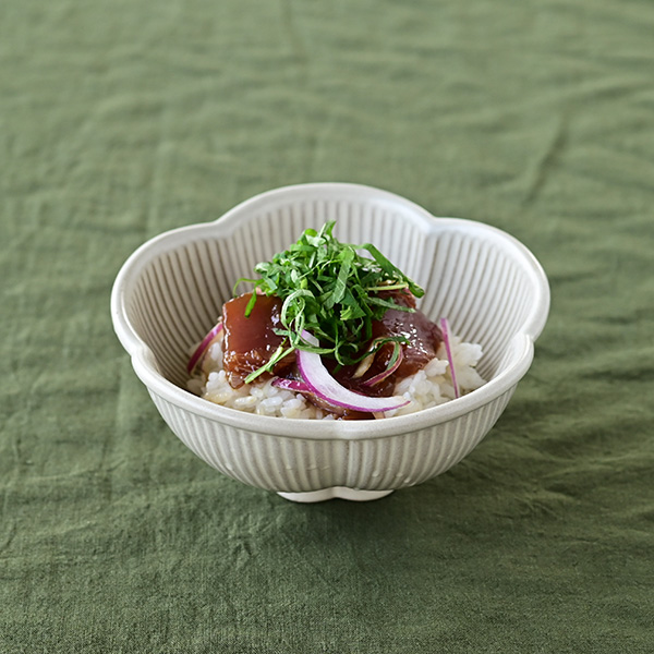 白いボウルは薄手で軽やか。粉引きの柔らかさや優しさが感じられます。黒い丼はシンプルな形状と荒土を使った素材感のバランスが魅力。花形の器は、シンプルなメニューを華やかに彩ってくれます。ふっくらと丸みのある丼は、外側のレリーフが際立ち存在感があります。