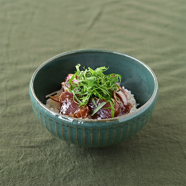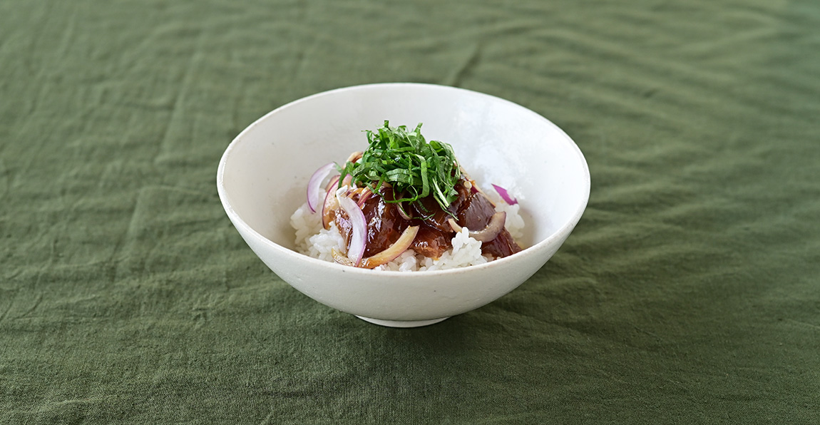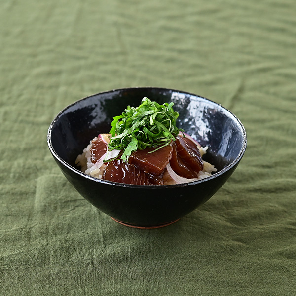 2.丼にごはんを盛りつけ、紫玉ねぎの薄切り、①のかつお、刻んだ大葉をのせる。