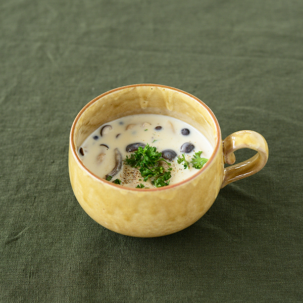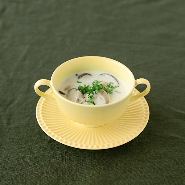 口径の広い器は、無駄を削ぎ落としたデザインで気取らずカジュアルな印象。ハンドル付きのスープカップは、手で包みこんでほっこりしたい時に。両手付きのスープカップは繊細なレリーフが華やかな雰囲気。高台つきのボウルは、ぽってりと厚みのある素材で味わい深く見せてくれます。