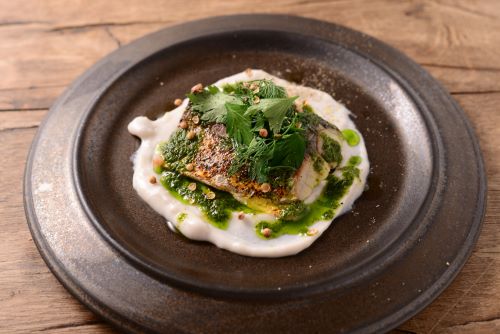 香ばしく焼き上げた鯖、パセリの香るソースをかけて。