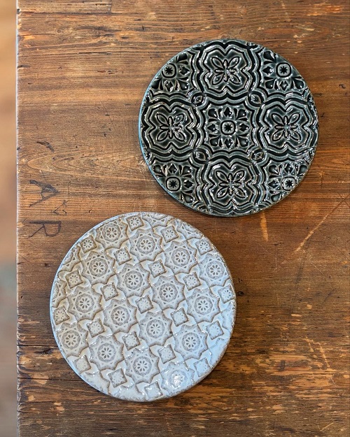 「ラウカウ小紋銘々皿(窯変白)」・「ラウカウ大紋銘々皿(濃藍)」