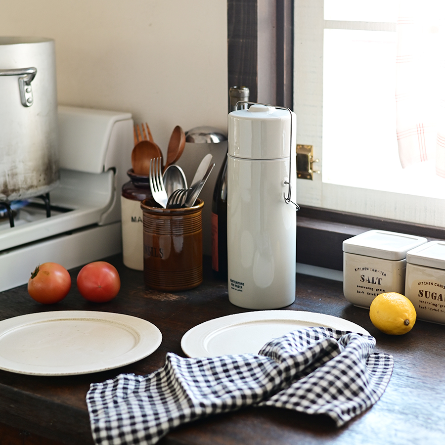 ほんのりグレーを帯びた土の表情と、素朴な金具の組み合わせがアンティークのキッチンツールを思わせます。