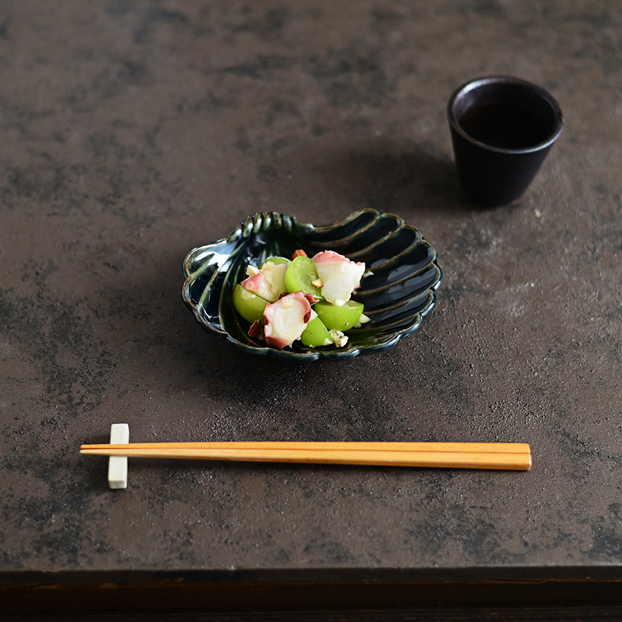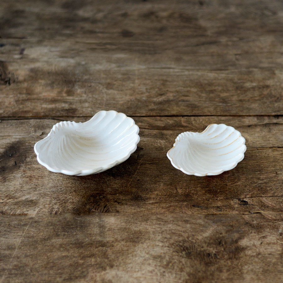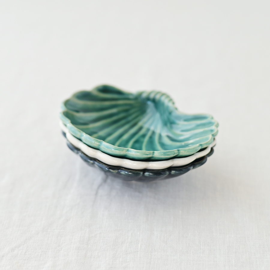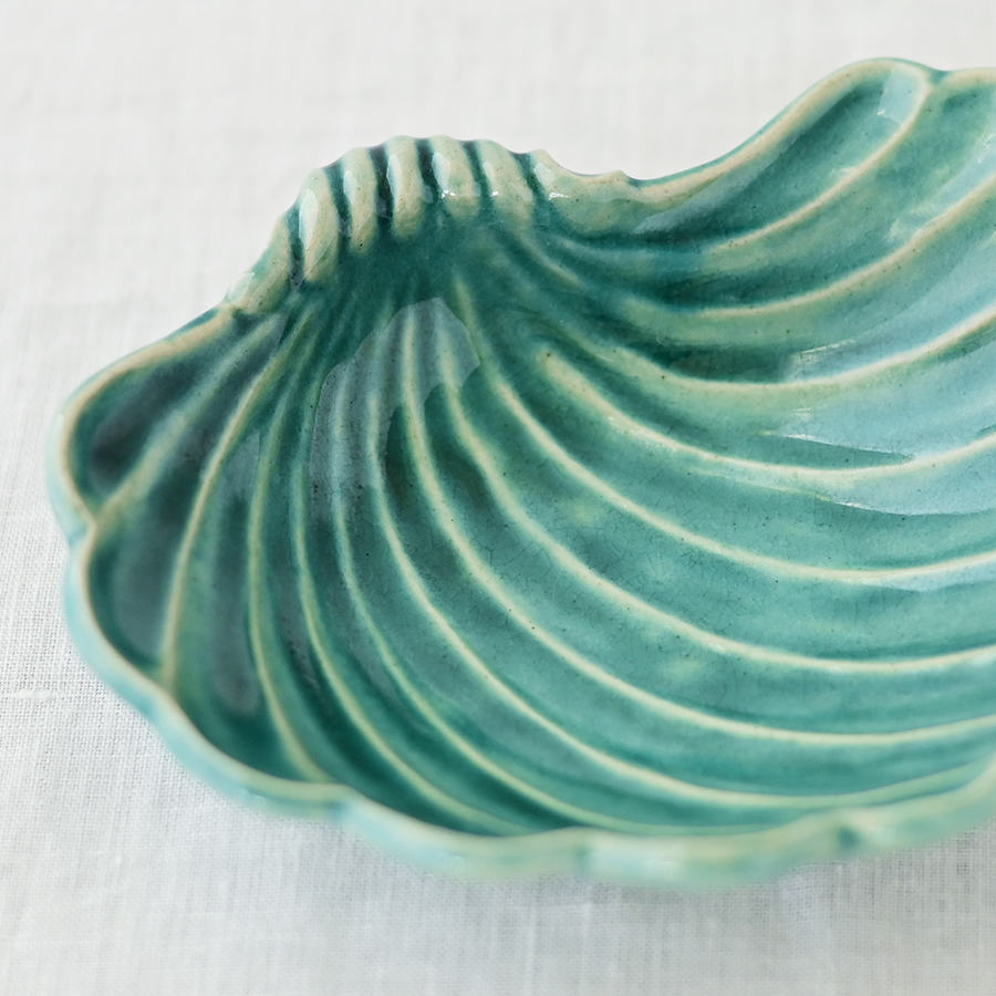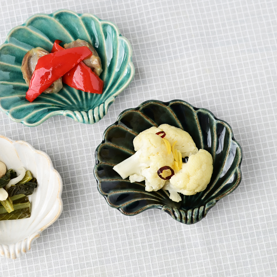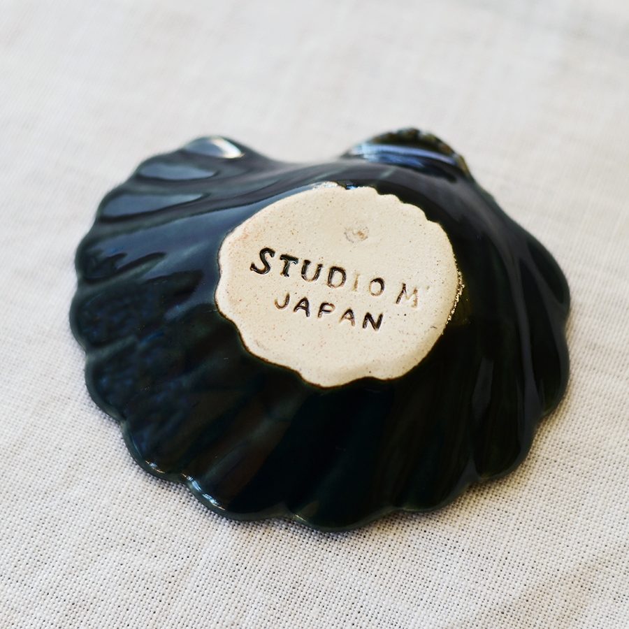 釉薬の溜まりによる濃淡が美しく、貝殻モチーフの有機的な形とよく調和します。