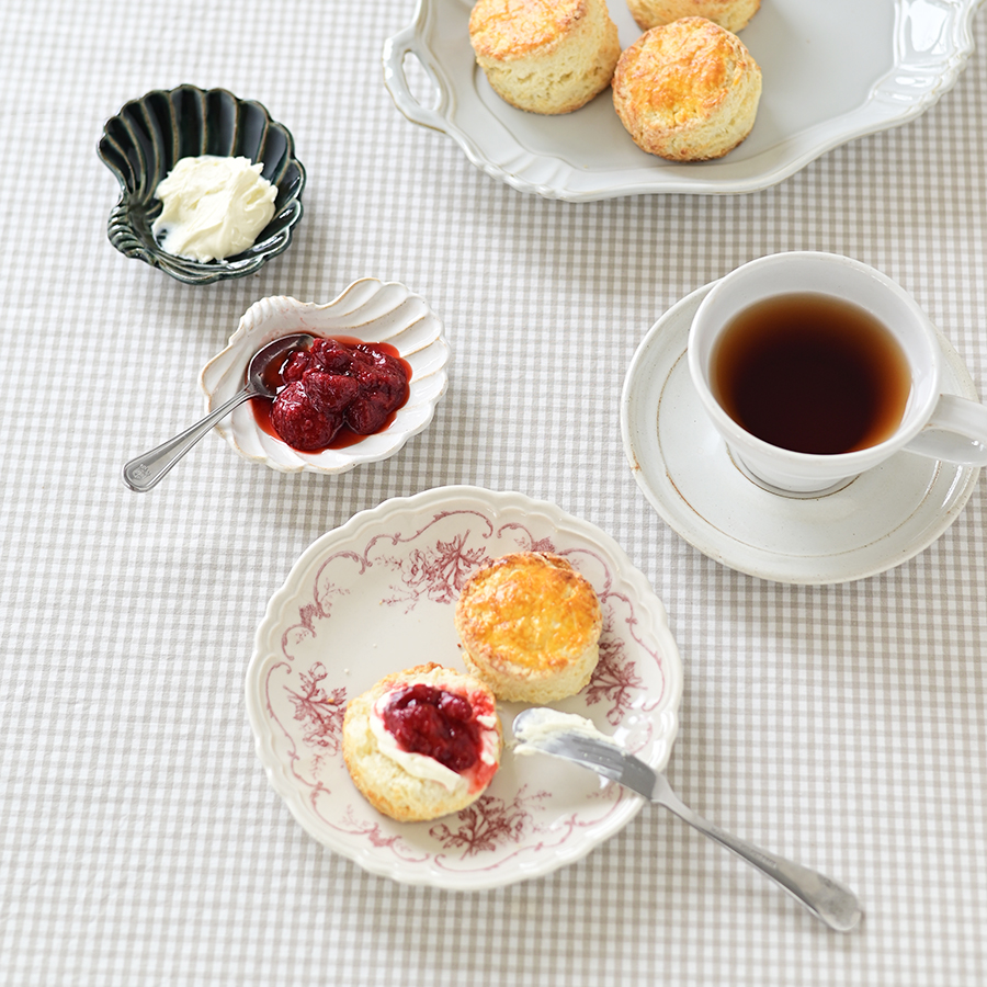 ジャム、クリームをのせて、スコーンに添えれば、可愛らしいティータイムコーディネートに。
