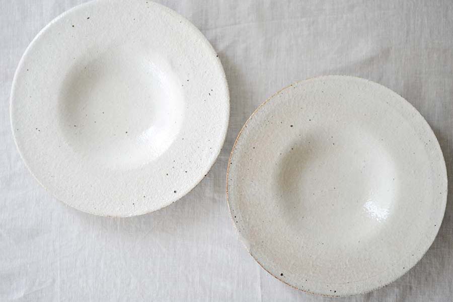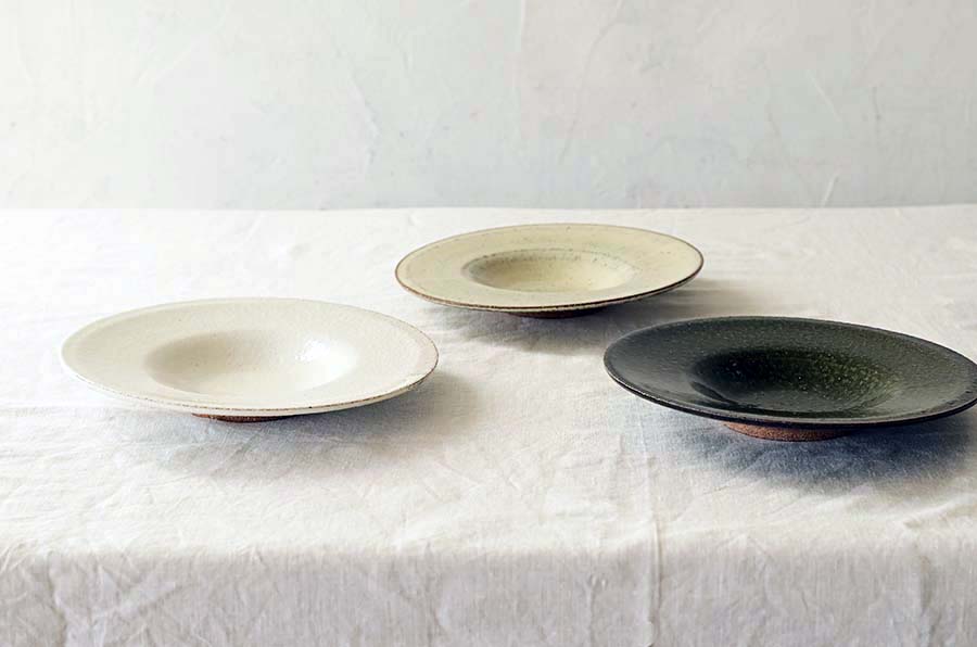 広いリムは、盛り付け部分とのコントラストを際立たせ、ひと皿を演出するための舞台装置です。 高台は極力小さくし、浮遊感のある軽やかな佇まいを目指しました。