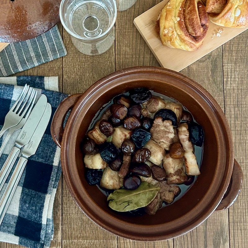 塩豚と栗、きのこ、プルーンを入れた、秋にぴったりの土鍋料理をご紹介します。