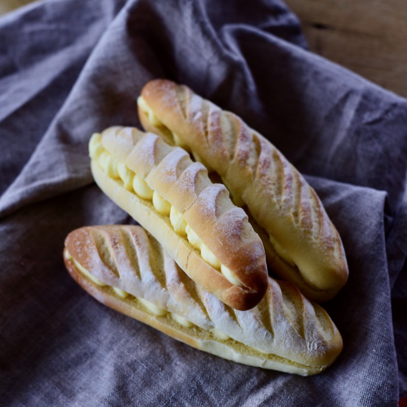 ソフトフランスの生地のパンに、甘いミルククリームを挟みます。お子様も大人も大好きなパン!