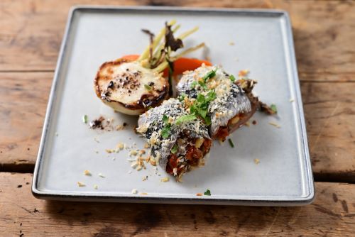 ドライトマトやケッパー、オリーブを混ぜ合わせた具材をイワシで包み、