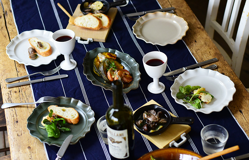 暗めの色合いが料理の彩りを引き立て、テーブル全体もぐっと引き締めてくれます。