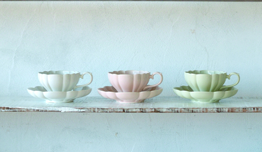 花型のカップ&ソーサーが並ぶテーブルは、