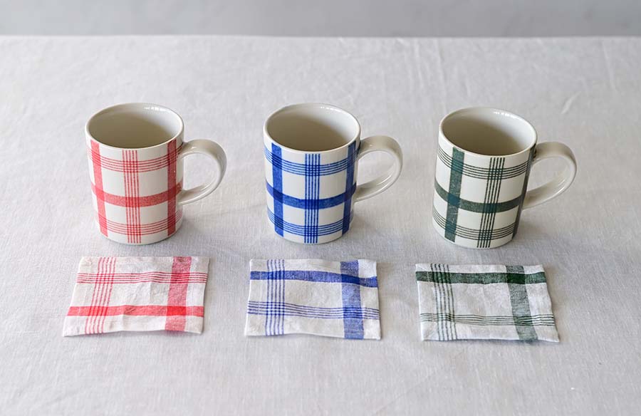 布の質感やチェックが生み出す軽快なリズムを器の上に写し取りました。