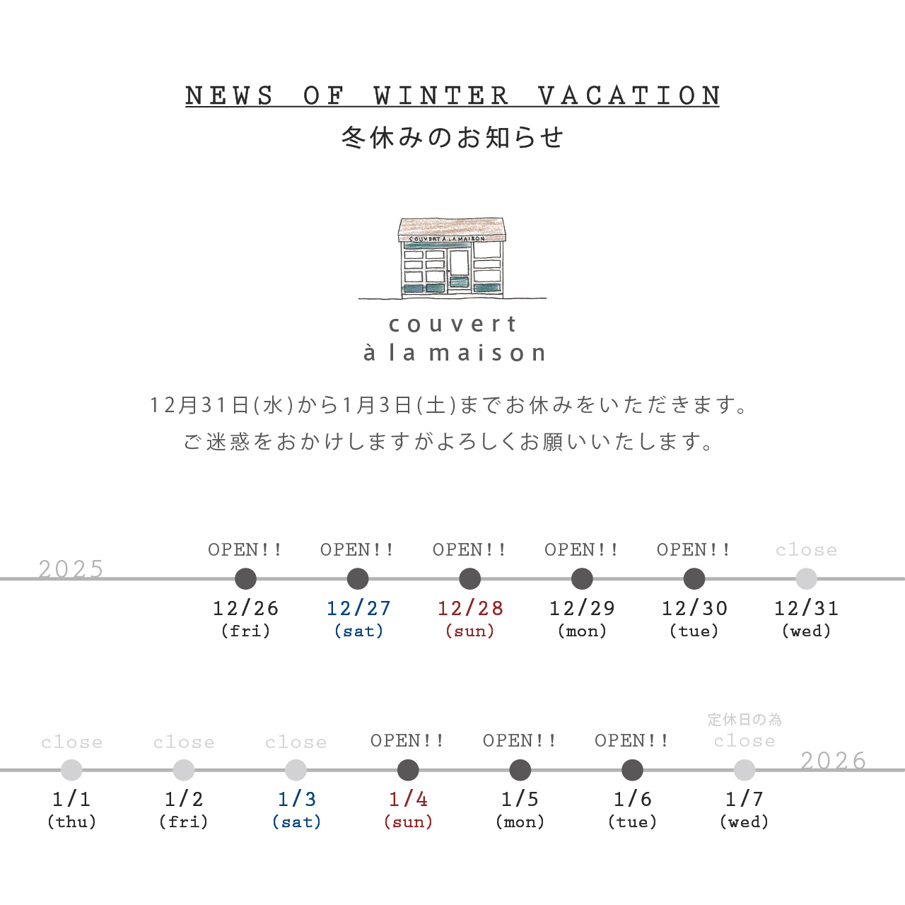 12月31日(水)~1月3日(土)まで冬休みをいただきます。