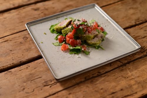 パセリとにんにくを合わせたパン粉をまとわせたレアカツ。