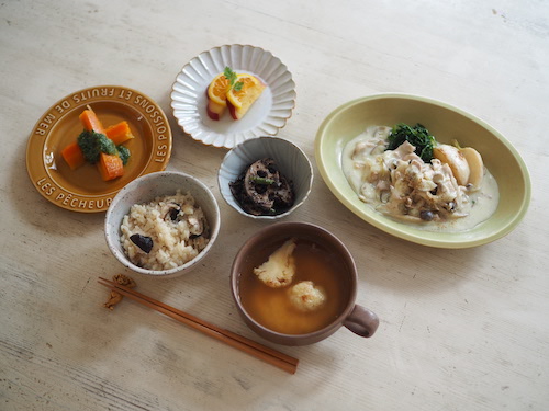 しめじや玉ねぎ、お出汁の旨みが効いたクリームソースで煮込みました。
