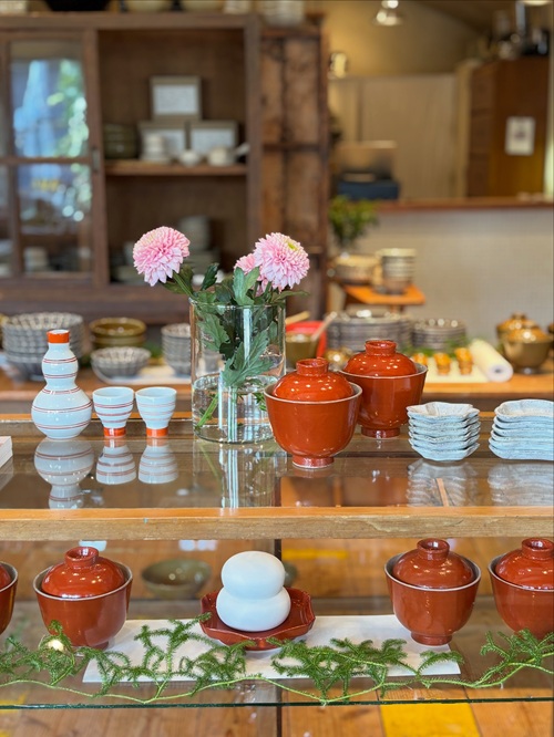 おせちの食卓を華やかに引き立てる、色鮮やかな器が店内に並んでいます。
