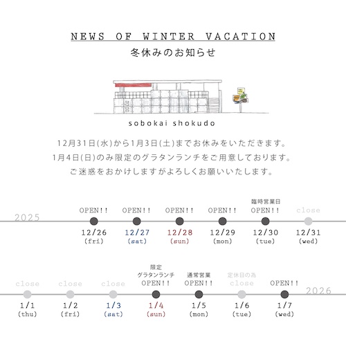 「ソボカイ食堂 年末年始営業のお知らせ」