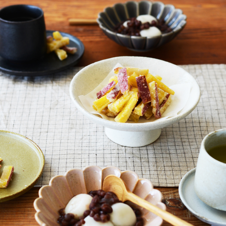秋の甘味が似合う土の風合いで、色は3色展開。