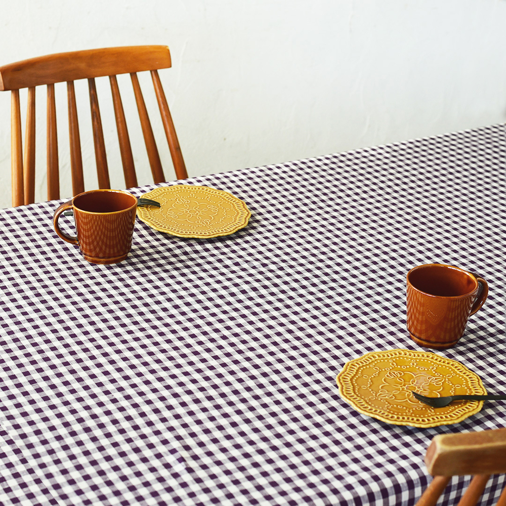 打ち込みが多くハリ感があり、しなやかで手馴染みが良い生地。1cm幅のチェック柄は、落ち着いた大人っぽさがあります。深みのあるパープルは、お野菜のグリーンやパスタのイエロー等お料理の色味と相性が良く、食卓に取り入れやすい色です。