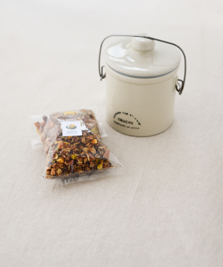 - ウェブストアにライナップされている、上質なリネン生地のオリジナルエプロンを紹介。