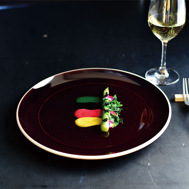 外寸280mmサイズの盛り面が広い大皿です。朝はリッチな限定モーニングセット用として、昼はランチで小鉢を乗せてワンプレートランチ用として、夜は副菜を添えてメイン料理用として、一日を通してフルに活躍するプレートです。ワイン色は鍋料理などの盛り込み用として和食でも違和感無く使えます。