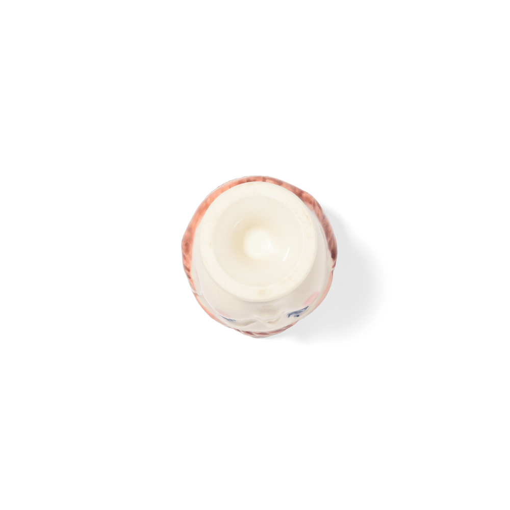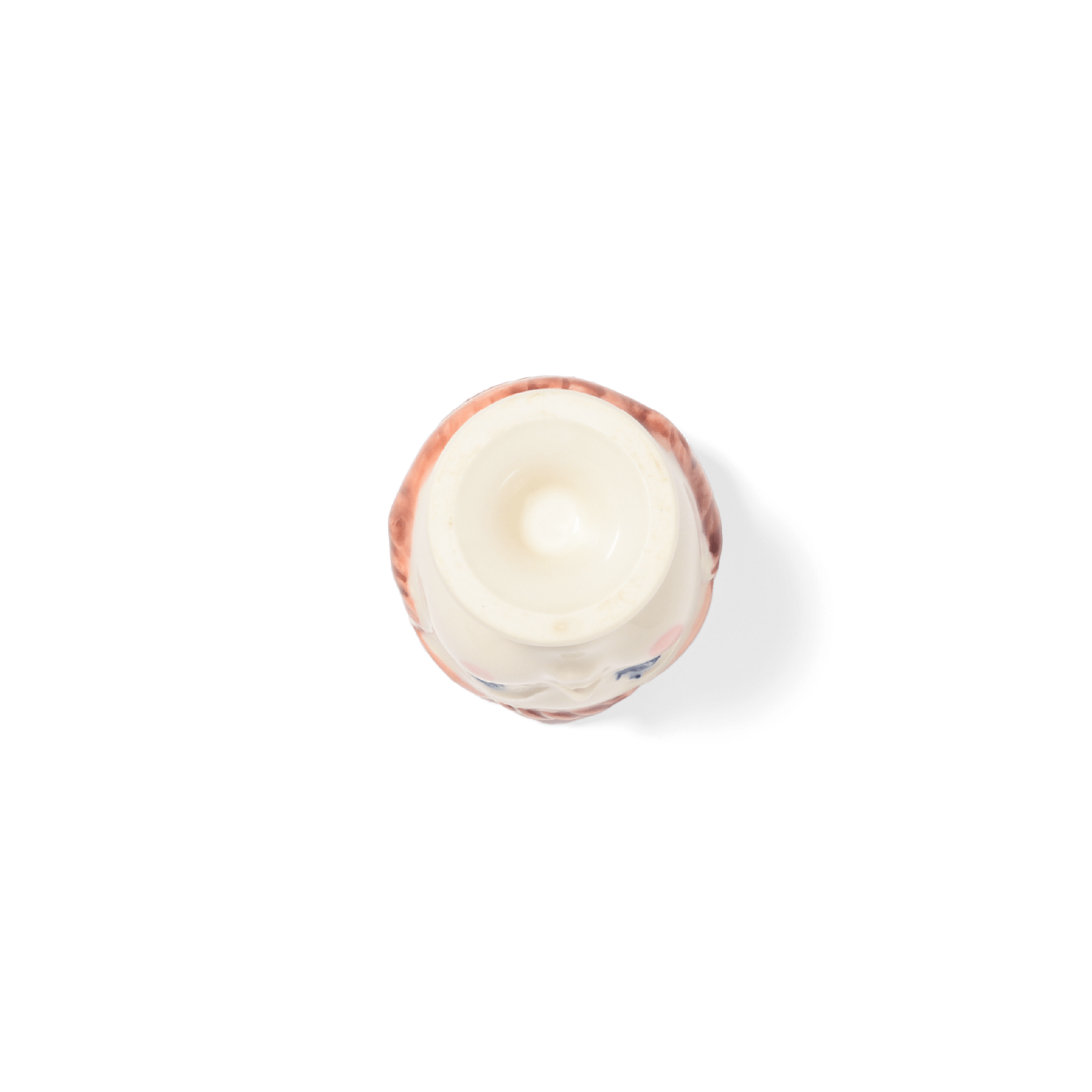 職人による丁寧な絵付けも見どころ。やわらかなブルーの瞳、ピンクのほっぺ、栗色の髪はふんわりカールがかっています。絵の具の塗り方や筆使いによって、ひとつひとつに個性があります。裏印は手描きのサインを型に彫り込み温かみを添えています。磁器のやわらかな色味とよく合ってどこか懐かしい雰囲気が漂っています。
