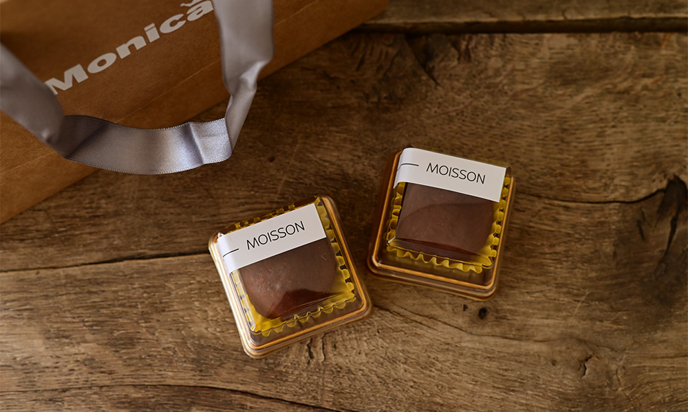 ヴィーニュの菱形プレートの中央に、チョコレートをふたつ。ひとつは丸いまま、もうひとつはカットして断面をこちらに向けます。ブルーの器の上で、チョコレートのブラウンと、内側にのぞくグリーンがくっきりと浮かび上がり、それだけで視線が自然と集まります。装飾のある器ですが、絵柄が主張しすぎず、甘いお菓子を大人っぽく受け止めてくれるところが、ヴィーニュらしさ。