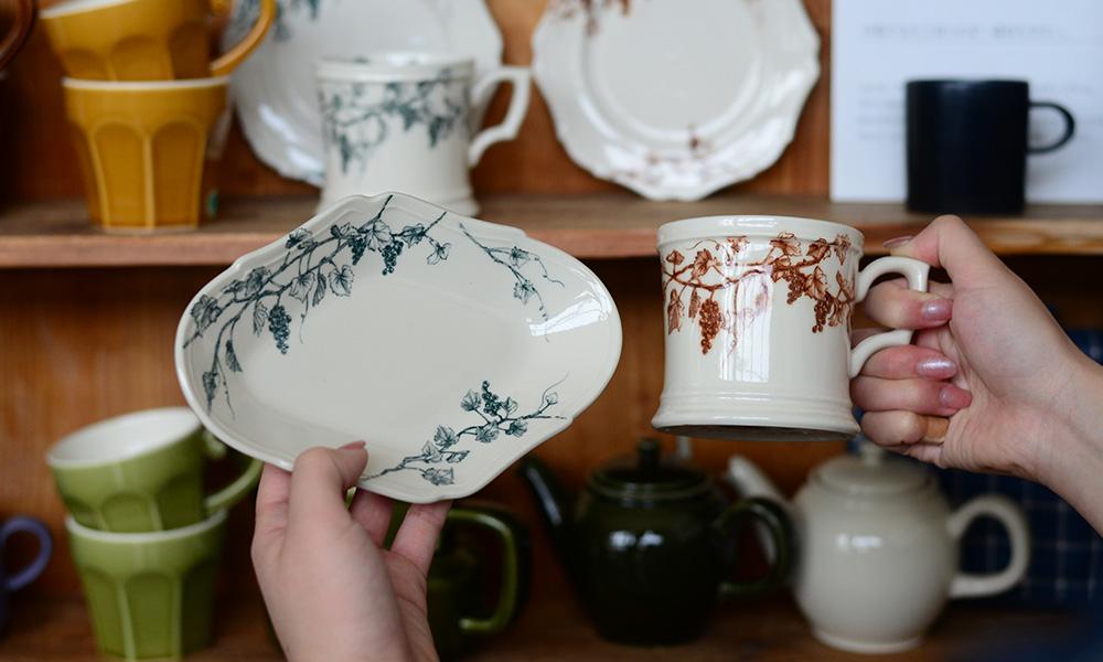 まず思い浮かんだのは、ヴィーニュのプレート。ブドウの葉と実が描かれた絵柄は、どこか瑞々しく、これからの季節にぴったりの軽やかさがあります。