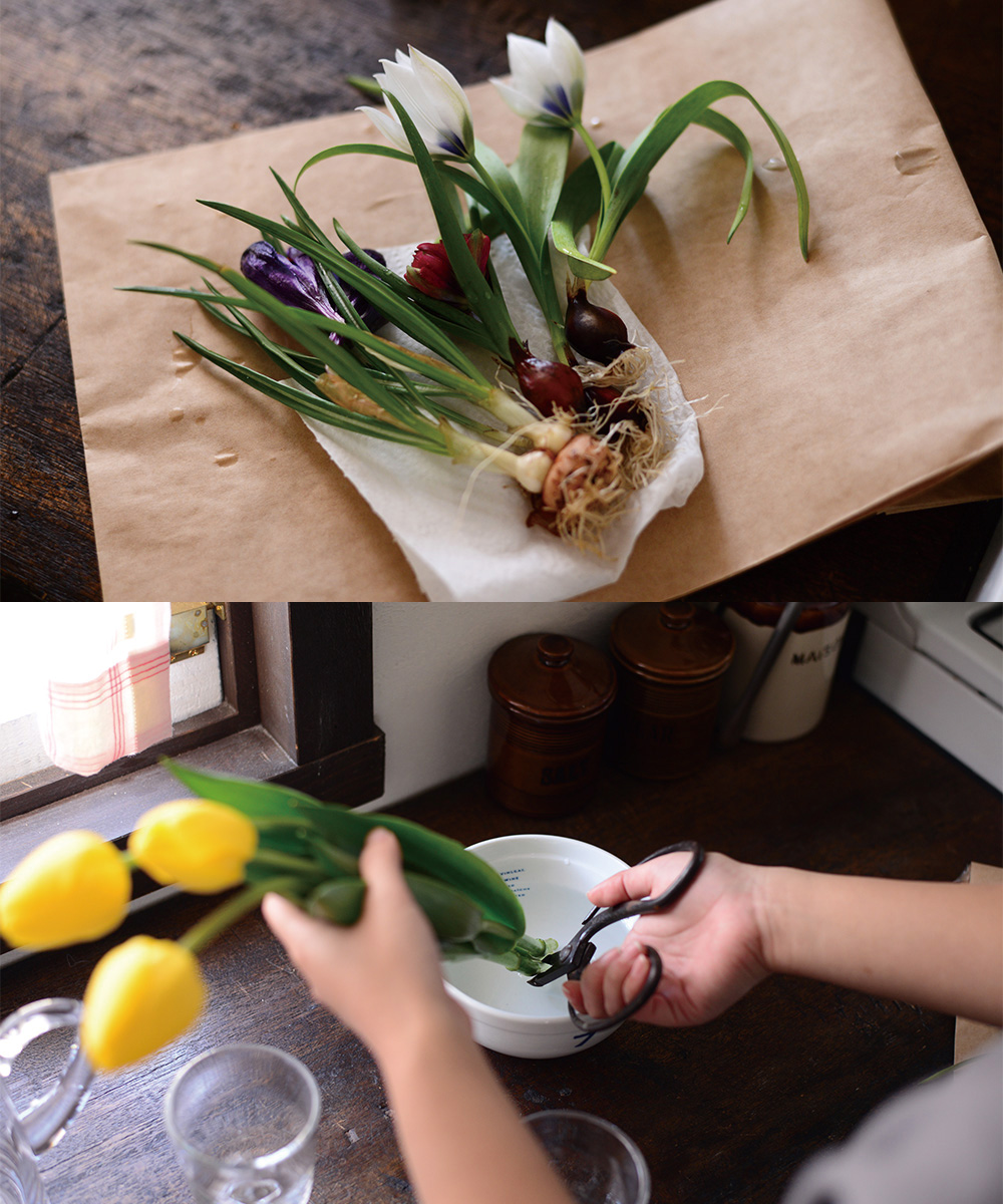 小さな球根花には、ゴブレット、ワイングラス、タンブラー(S)を使って。高さの違うグラスに活けることで、背丈の低い花も自然と立体感を持つと思いました。一方、大きな黄色の一重咲きチューリップにはピッチャーを。水をたっぷり含ませ、のびやかに。ミニ球根とはあえて器のスケールを変え、空間のアクセントとして扱うことにしました。
