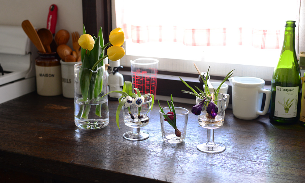 今回は、SNSで見かけたワイングラスに球根花を活けるアイデアから。いろんな高さのグラスに、ちょこんと春の花。その自由で軽やかな佇まいが愛らしく、思わず真似してみたくなりました。