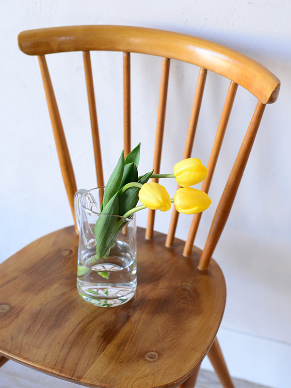 そして存在感のあるピッチャーに活けられた、黄色の一重咲きチューリップ。階段下の椅子の上へ置けば、そこが自然と家のフォーカルポイントに。日常の動線の途中に、ひとつの春の日だまりが生まれました。