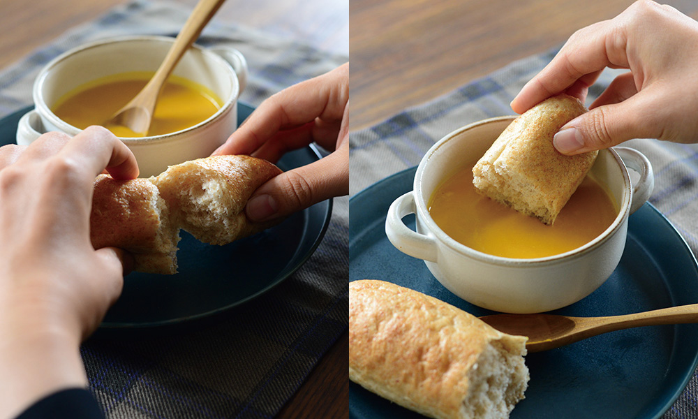 温かいスープカップの下には「レカ220プレートインディゴ」。少し空いたスペースに、こんがり温かい全粒粉のロールパンを。「タータンチェック」のランチョンマットを敷けば、自然と穏やかであたたかいテーブルに整っていく。ヴルーテをそっと両手で包み込むと、指先からあたたかさが伝わってきて、少し強ばっていた肩の力がふっと抜けていく。手のひらに伝わる“ぬくもり”と、器の“まるみ”が、静かに寄り添う。その一瞬に、日常の忙しさから解き放たれるような心地よさがありました。