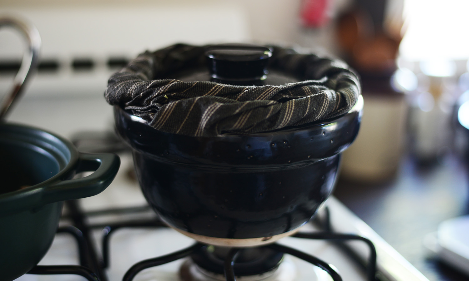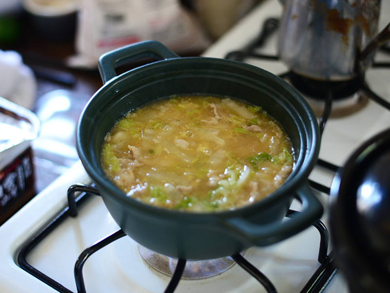 大きな持ち手が特徴の土鍋で味噌汁を作る。