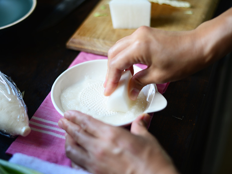 コンパクトな陶製のおろし皿で大根おろしを作って添える。