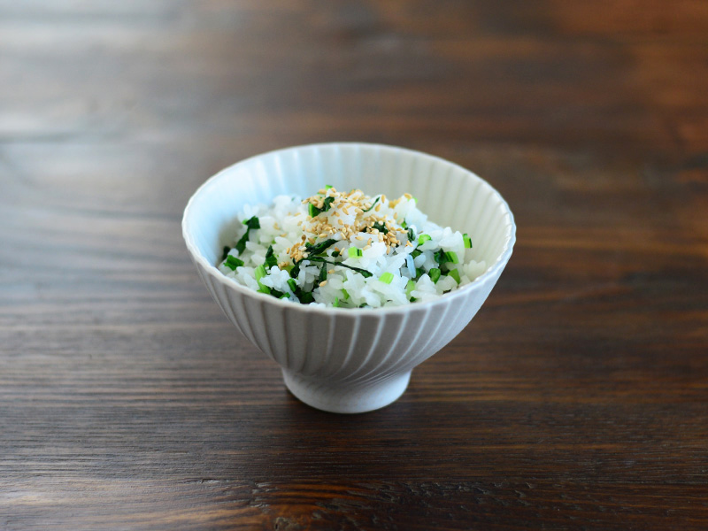 小松菜ごはんを盛りつけたのはドレープの様なシルエットがきれいな飯碗。