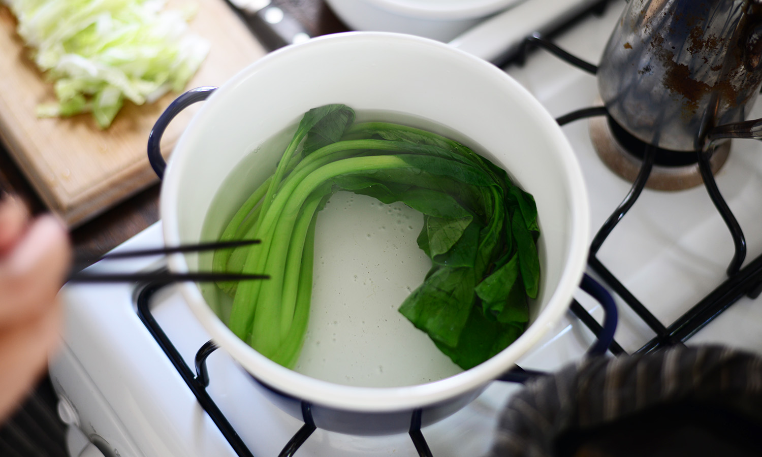 小松菜は茹でたらしっかりと水分をきって細かく刻む。