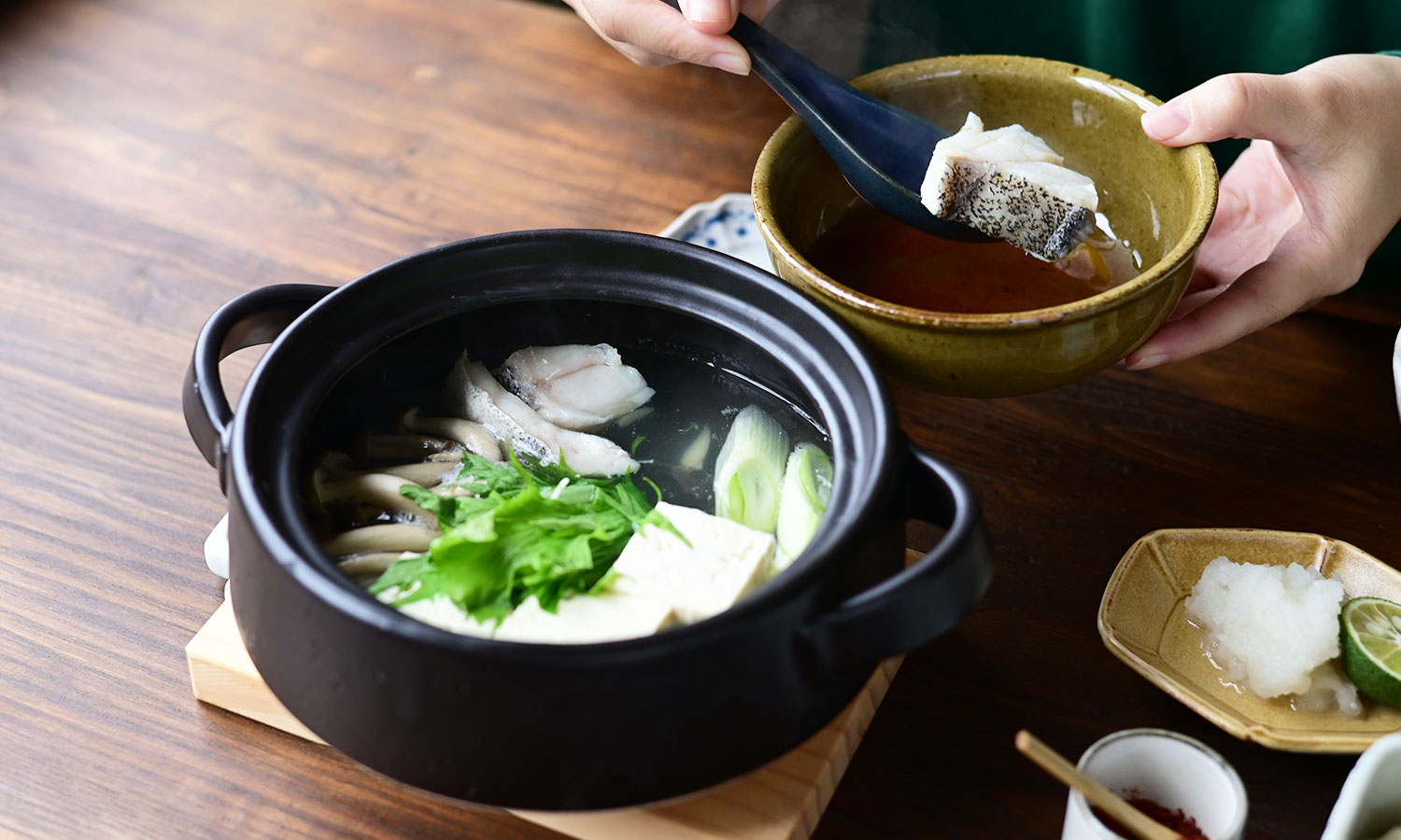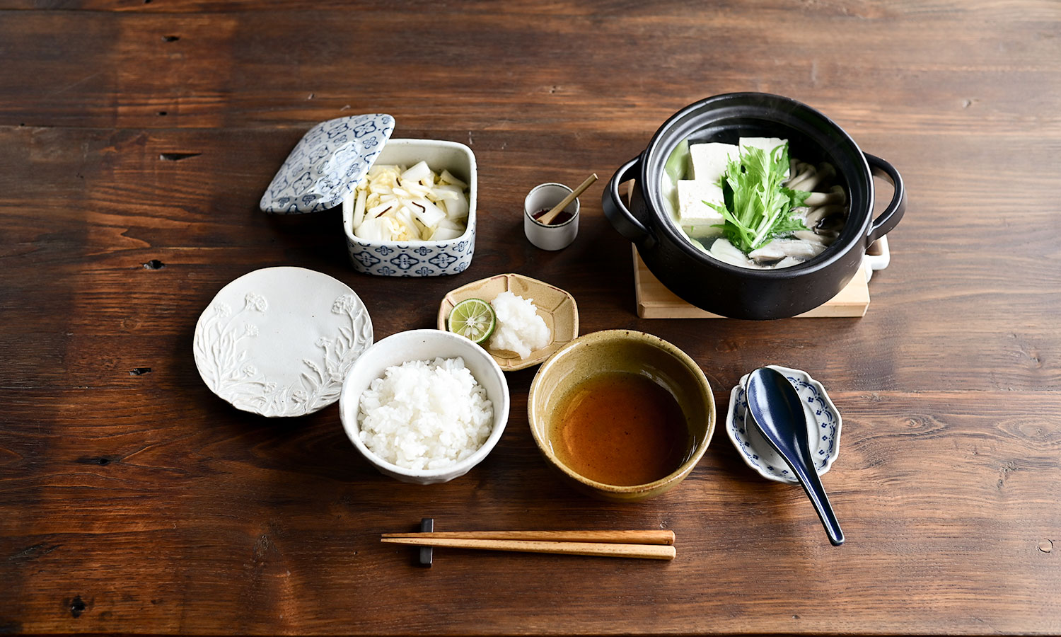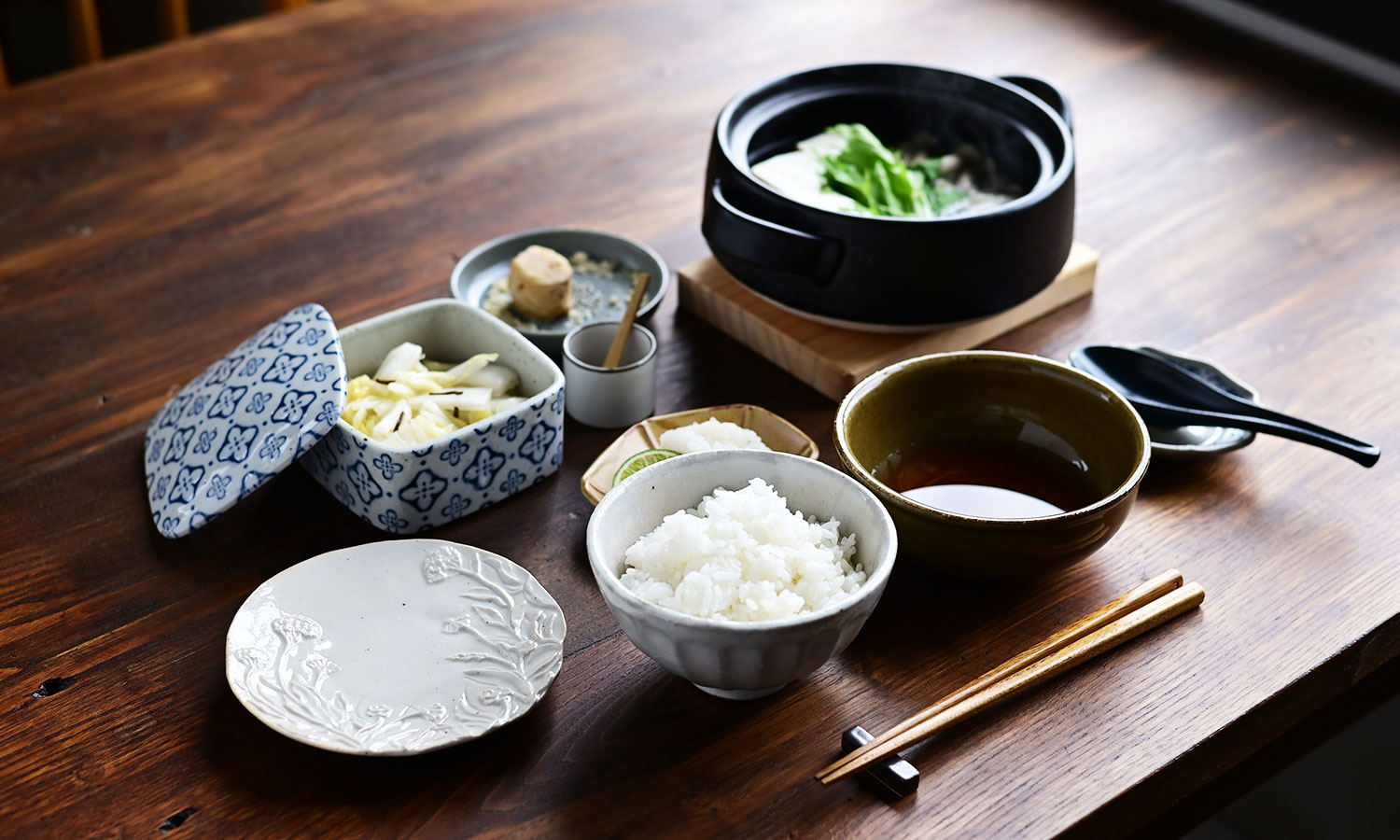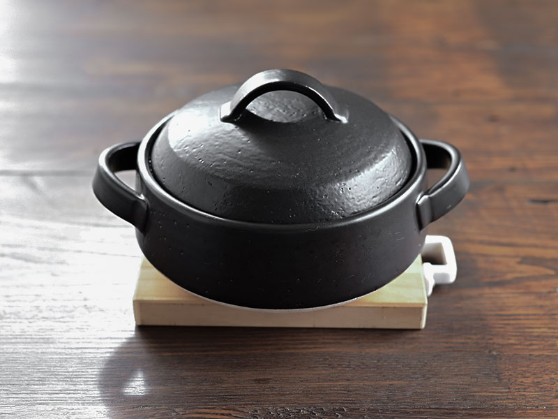 土鍋を中心に、温もりを感じる器のコーディネート。
