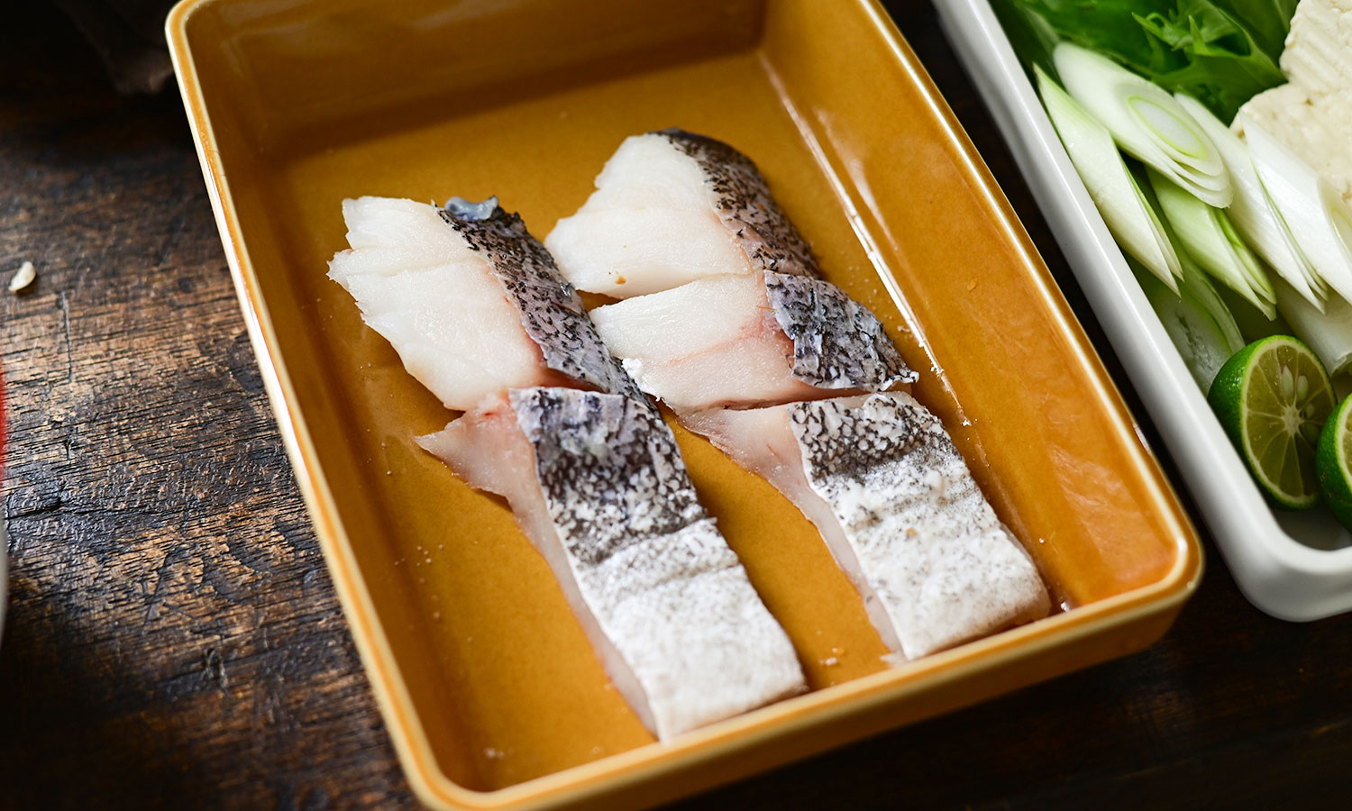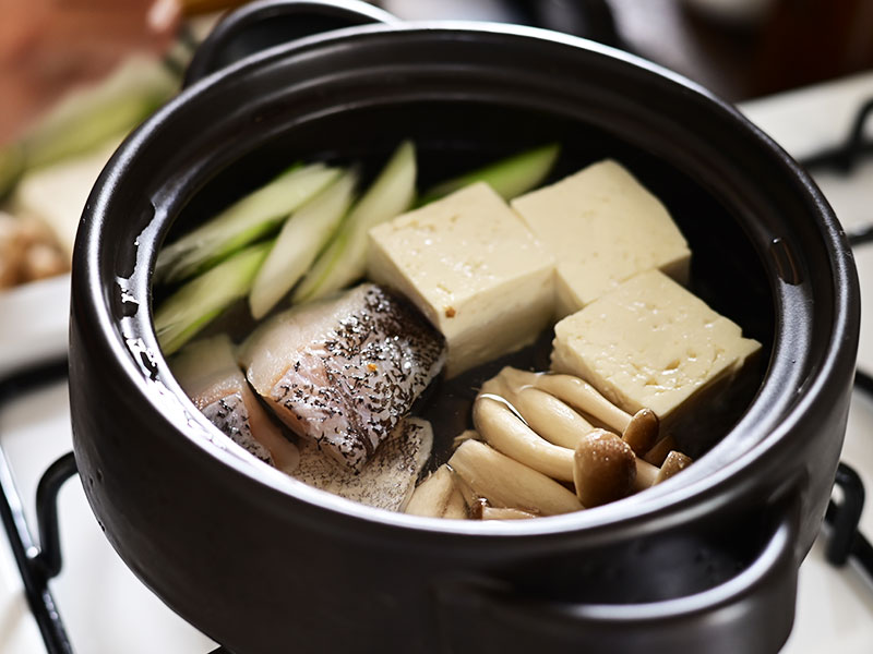 土鍋に昆布と水を入れ、たらを加えて火にかけます。