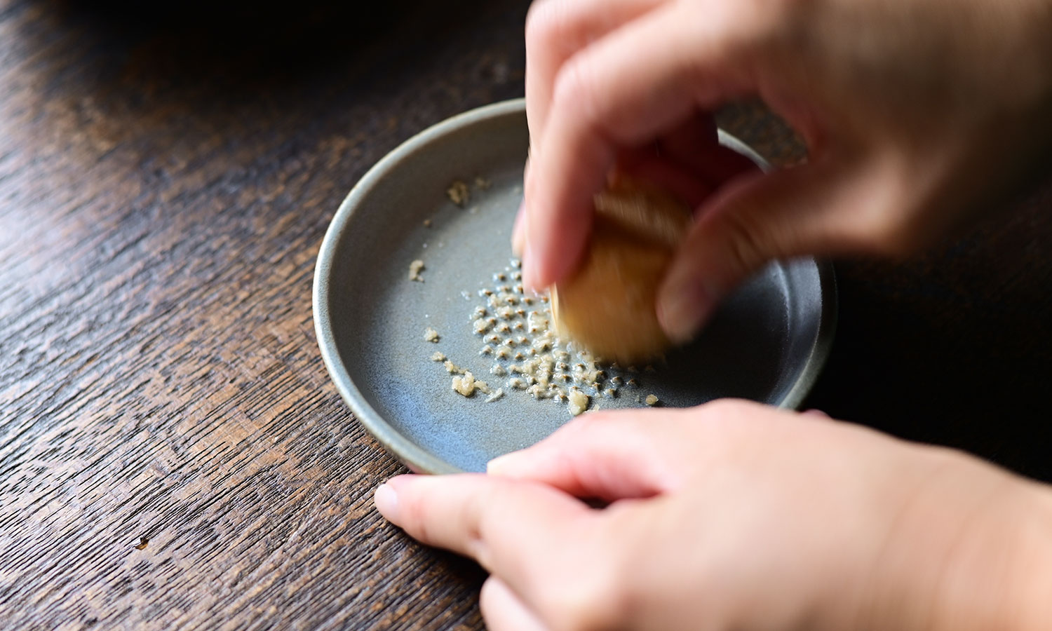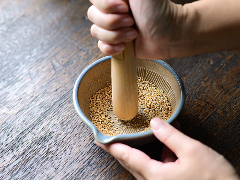 ごまを炒って香りをだしたら小さなすり鉢でする。