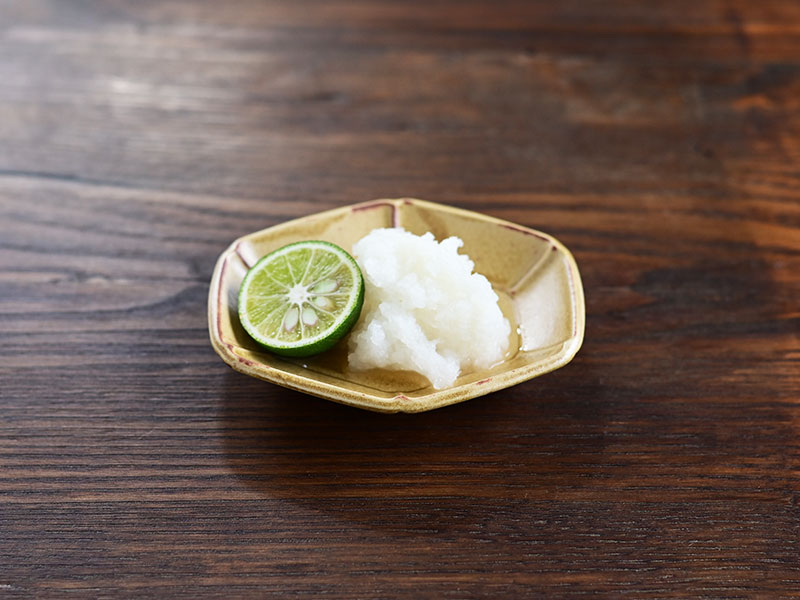 六角形の豆皿には大根おろしとすだちをのせて。