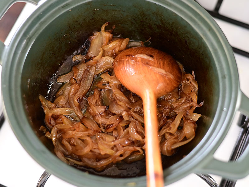 玉ねぎがアメ色になったらブイヨンを入れて弱火で煮ます。