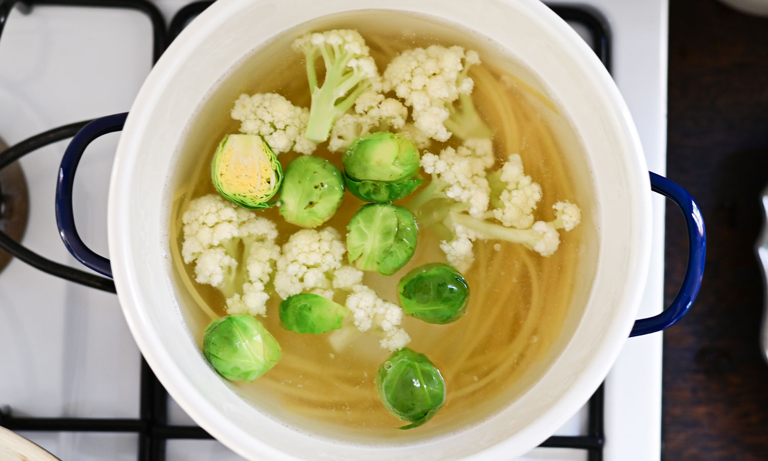 パスタと茹であがりを合わせて芽キャベツ、カリフラワーを加えて。