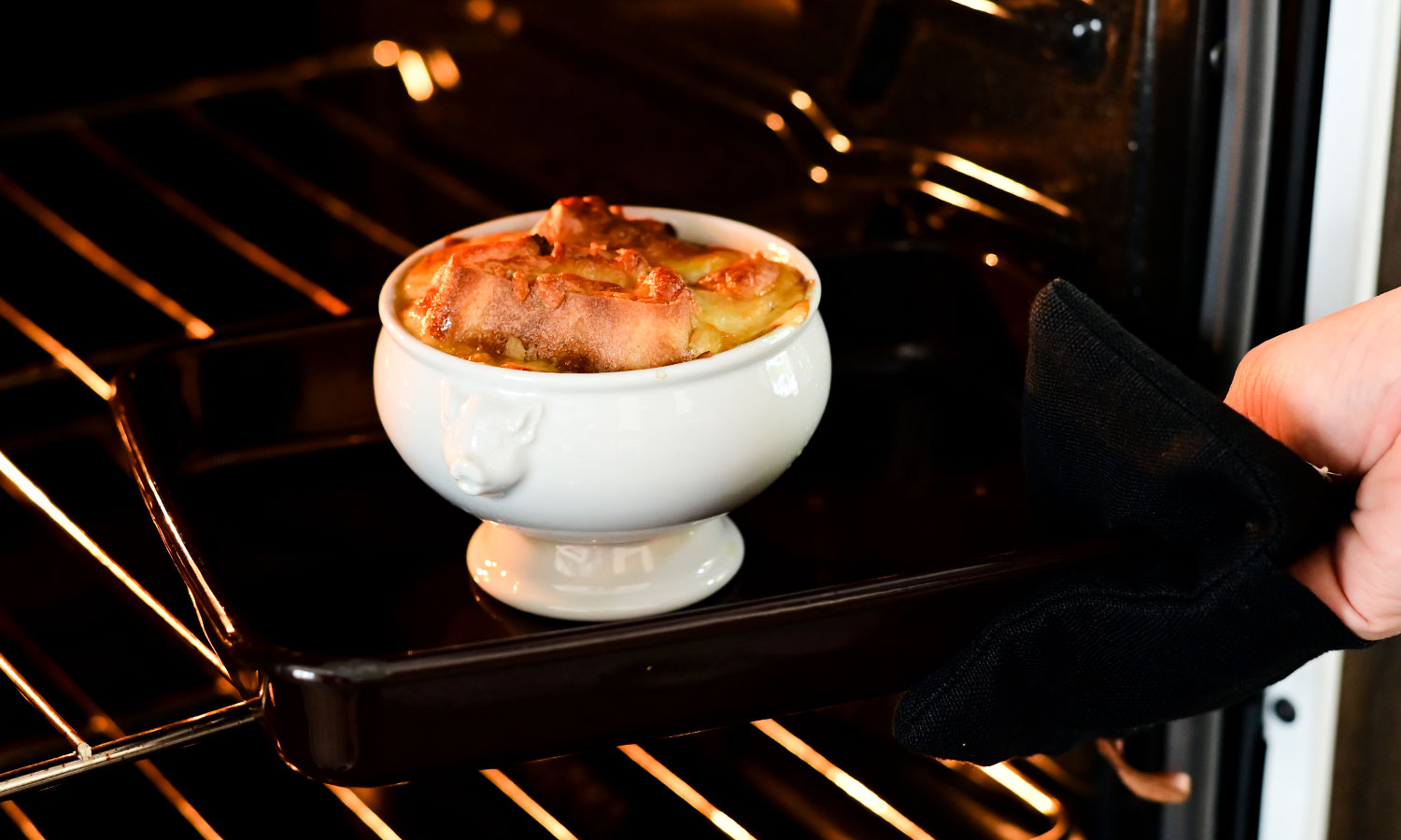 器にスープを注ぎ、バゲットとチーズをたっぷりのせてオーブンへ。