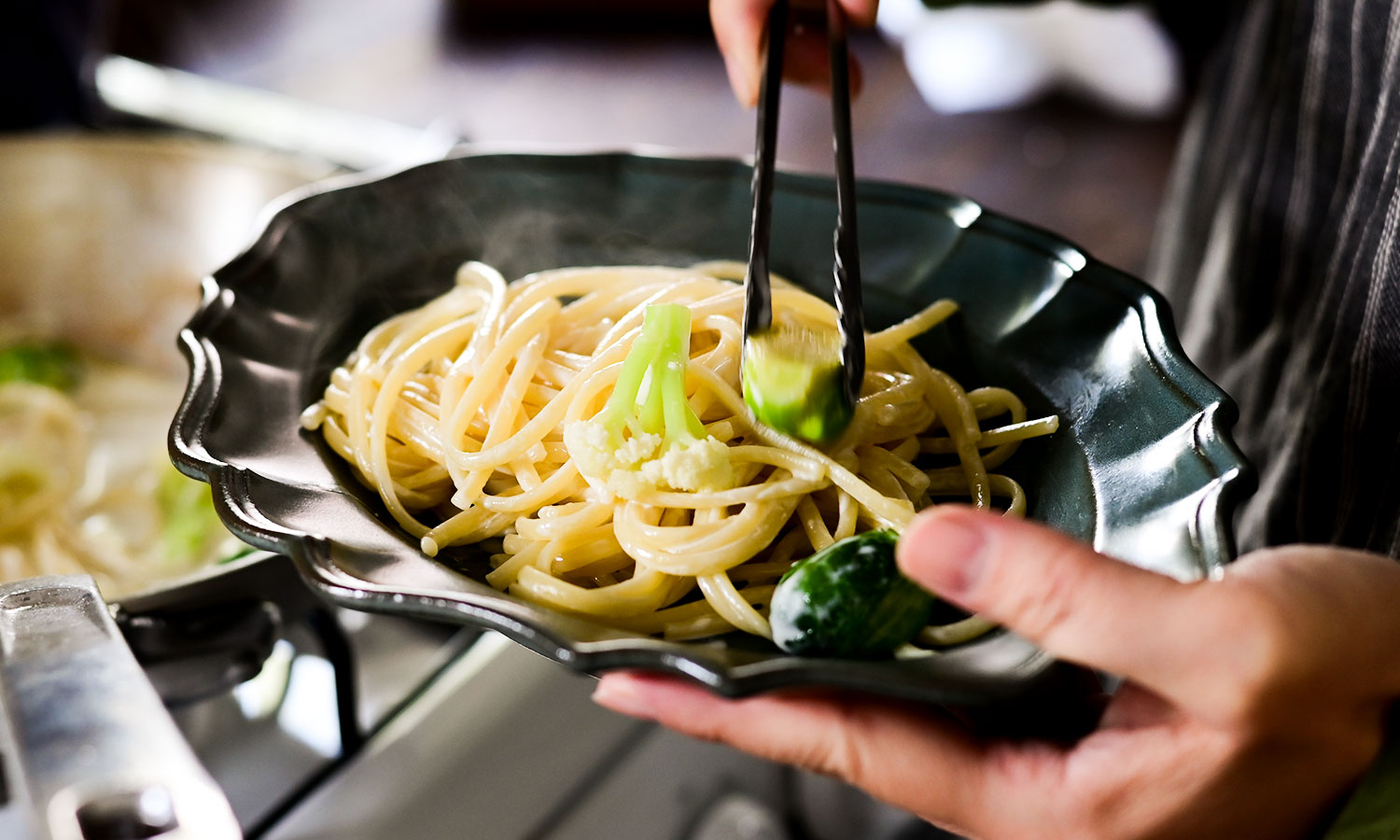 生クリームと茹で汁、パルミジャーノで味と濃度を整え、仕上げにレモンの皮を削り入れます。