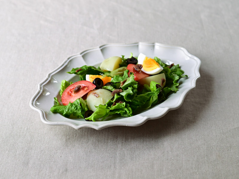 ボリュームのあるサラダを盛ったのは、アンティークのようなレリーフのきれいなプレート。