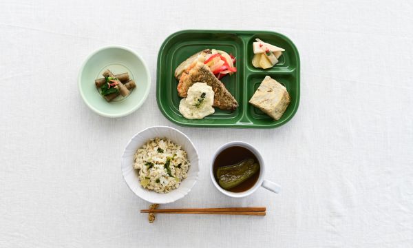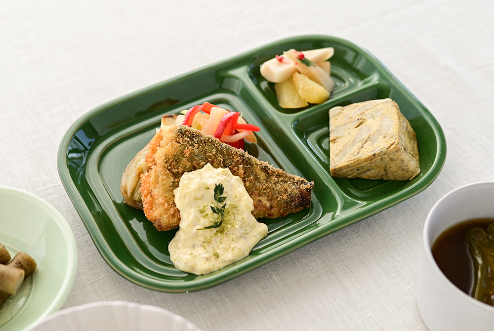 ハーブでマリネした鯵フライは、爽やかな山椒のタルタルソースで味わいます。 ごま油で炒めた菜の花の混ぜご飯、丸ごと焼いたピーマンの味噌汁を添えて。 うどや新ごぼうなど、香りや食感の良い春の食材を使った献立です。