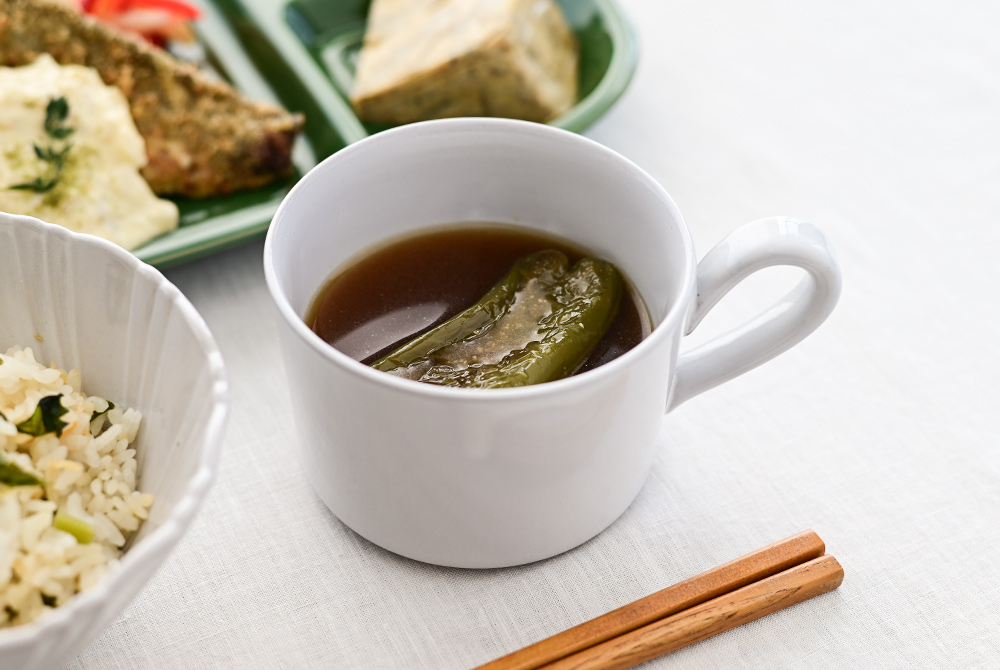 味噌汁は寸胴型で安定感のあるフォルムのマグカップに。 カジュアルな形状と赤土を使ったシックな素材感が魅力。