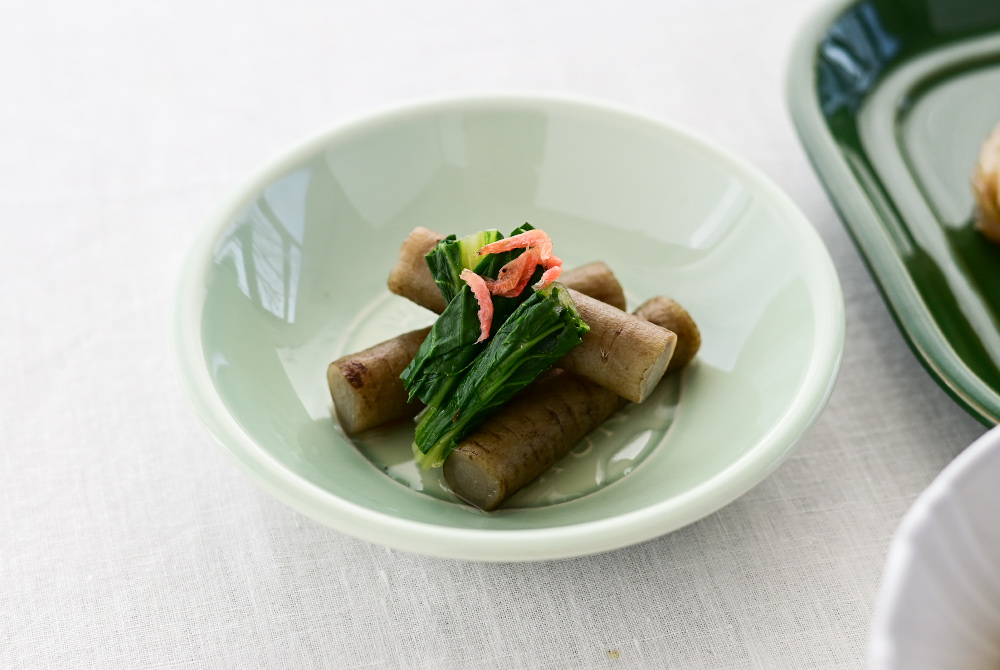 淡いミントグリーンのボウルは、仕切皿との色の組み合わせが爽やか。 新ごぼうをえび出汁で煮た、春らしい軽やかな煮物を盛りつけて。